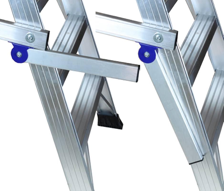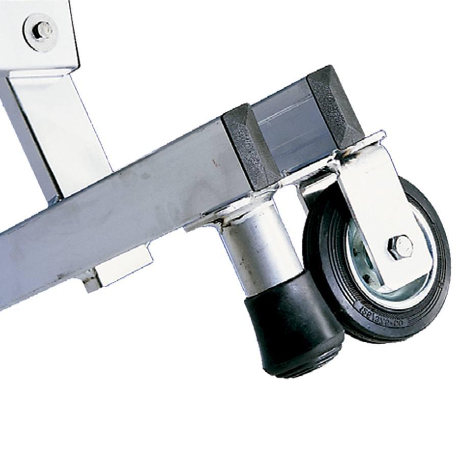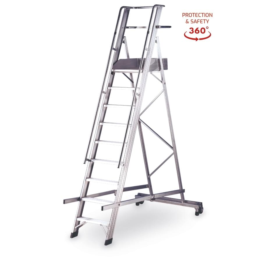Warehouse step ladder specially designed for workers who want to stay over an extended period of time (warehouses, cemeteries, maintenance, department stores…). It is made of ribbed aluminum which provides maximum strength. Steps welded to profiles that create a sturdy structure. Very convenient for its wide rise, deep steps and wide platform that includes a footer with a height of 15 cm, handrails and guard-rails 1 m in height which offers a lot of security. They include special wheels and handles for easy transport. The step ladder closes, facilitating storage. Optionally one can adapt a particular stabilizer for narrow passages 75 cm for areas with little space.