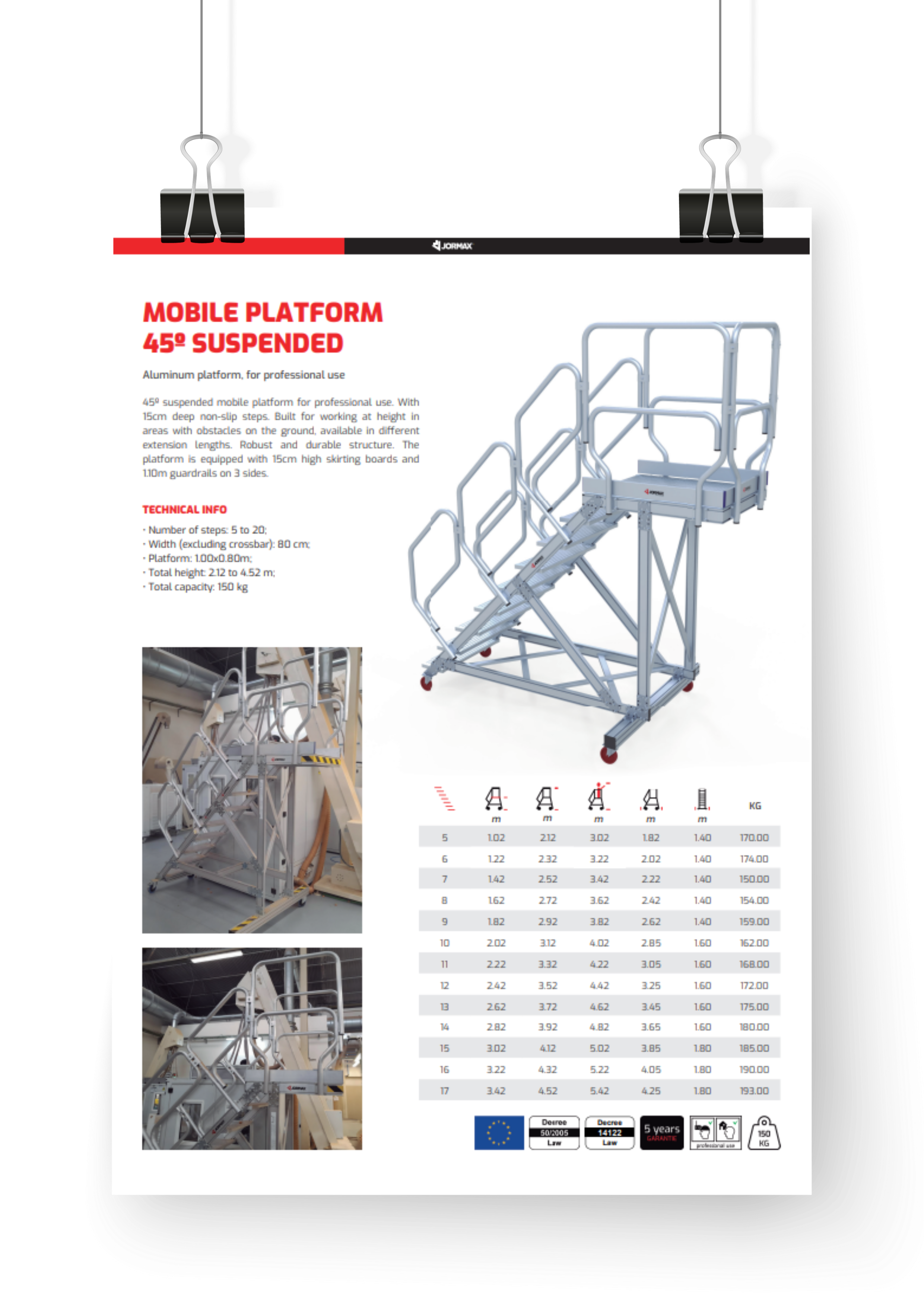45º suspended mobile platform for professional use. With 15cm deep non-slip steps. Built for working at height in areas with obstacles on the ground, available in diff erent extension lengths. Robust and durable structure. The platform is equipped with 15cm high skirting boards and 1.10m guardrails on 3 sides.