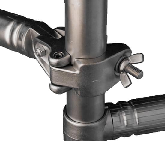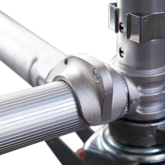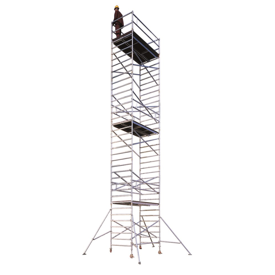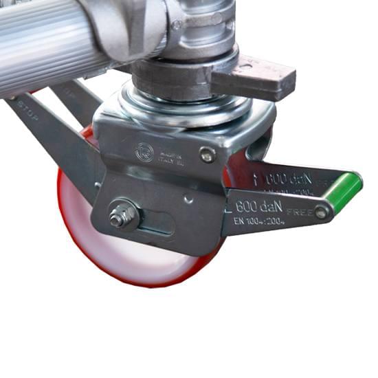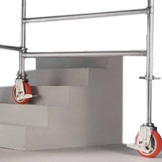 4 wheels of 125 mm diameter, 4 tornadoes feet of 400 mm, 4 scaffold height stabilizers, 2 horizontal cross members, 2 diagonals on each module with its boundary, 1 terminal module, 1 work platform with cover plus baseboards at every 4 m. Compositions are made in height with as many 7 step boundaries as possible. The outriggers can be P, M or G depending on the scaffolding heights.
