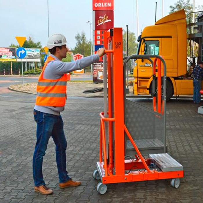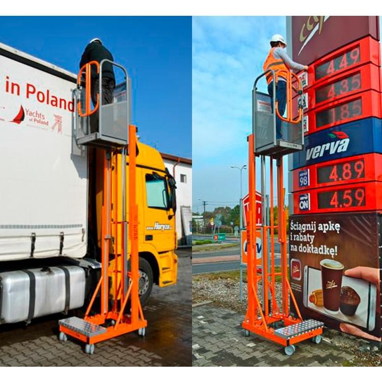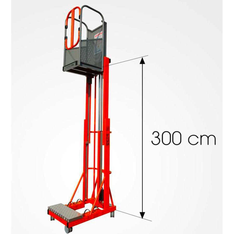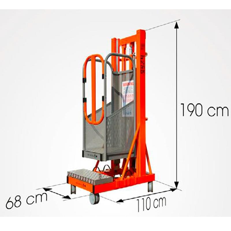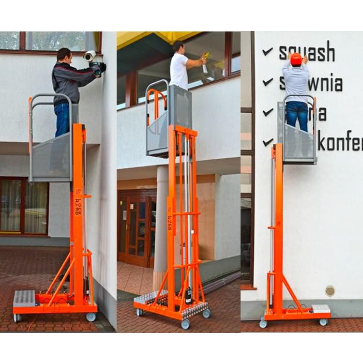 Telescopic aerial platform, equipped with electric lifting and manual handling. Made of aluminum and painted with epoxy paint. Rises by an electro-hydraulic system and can be conveyed only by a worker thanks to its lightness. For transport the counterweights (4 pieces of 15 kg) and the battery (9 kg) disassemble. It also features a lower price compared to the classic articulated aerial platforms. Combines comfort and affordability, is designed for maintenance, painting, cleaning, facilities, etc. In small dimensions, passes through doors and elevators. It can be used in companies, warehouses, supermarkets or buildings thanks to its small size.