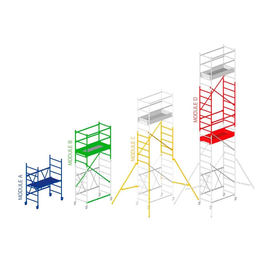 * Pour une utilisation en extérieur, le Castell Plus S de 6,76 m (A + B + C + D) conforme à la norme européenne sans ajustement nécessite 4 contrepoids (voir les pièces optionnelles).