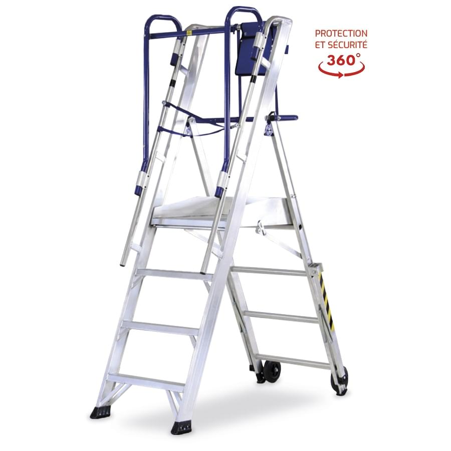 Conforme à la nouvelle norme européenne EN 131-7 de plateformes de travail individuelles offrant une protection de 360°. Il est équipé d’un système de stabilisateur déployant pour pouvoir travailler plié près d’un mur. Avec des marches larges sur la rampe de montée.