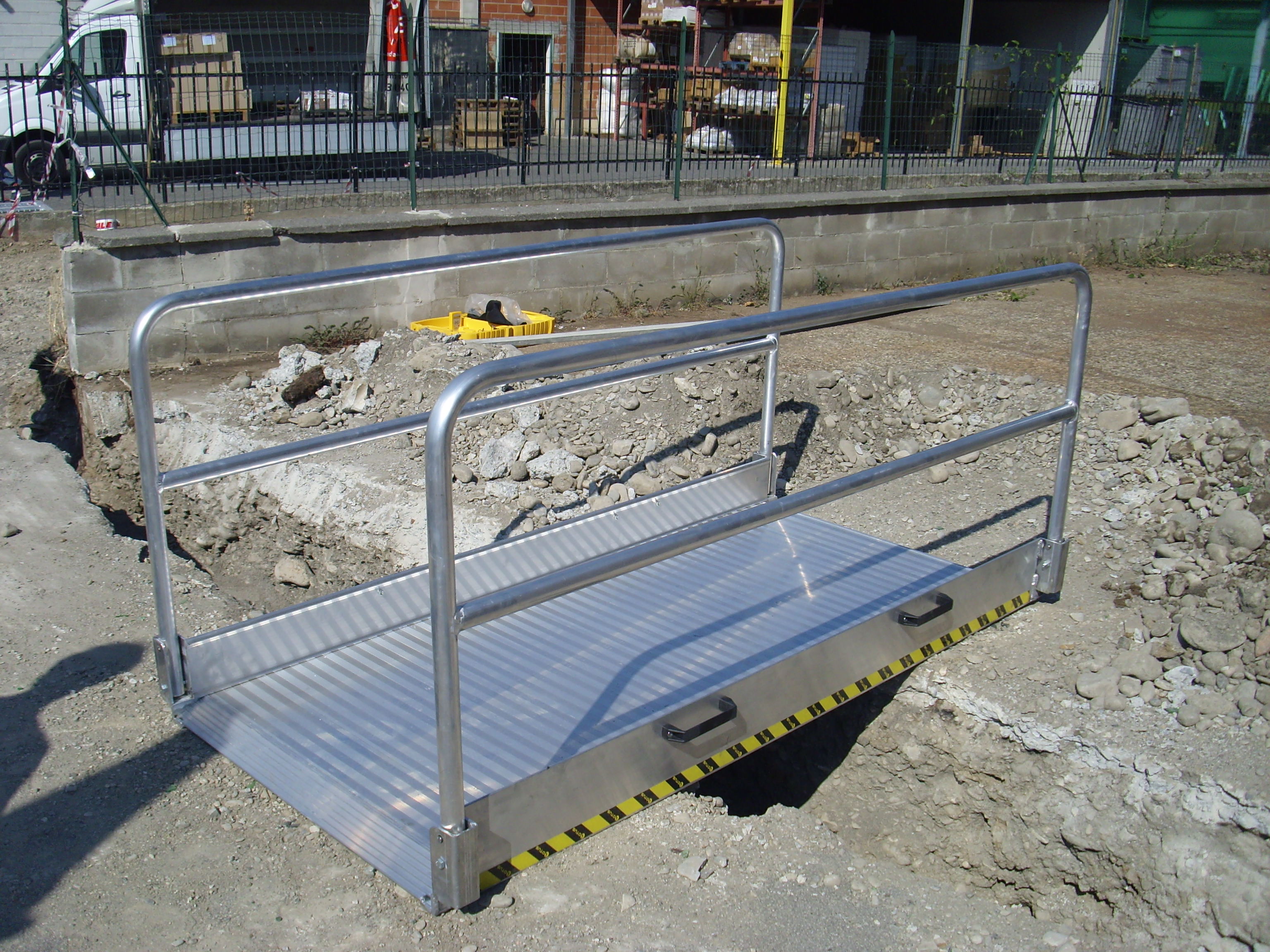 Passerelles en aluminium avec plinthe intégrée de 100 mm. Produites sur mesure, elles sont idéales pour les travaux sur les toits, les passages piétons dans des zones inaccessibles, etc. Construites avec des surfaces antidérapantes, les passerelles peuvent être équipées de planchers en aluminium ou de grilles. Elles sont faciles à monter et peuvent être fournies avec 1 ou 2 garde-corps de sécurité.