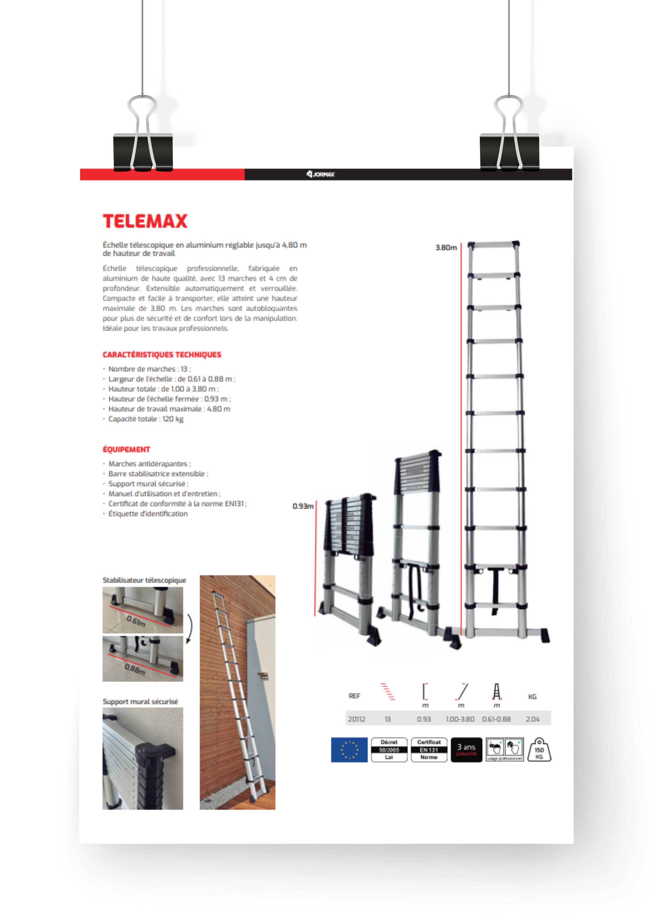 L’échelle télescopique TELEMAX PRO est fabriquée en aluminium de haute qualité, avec 13 échelons, extensible automatiquement et se verrouillant en toute sécurité. Elle est compacte et facile à transporter, avec une hauteur de travail allant jusqu’à 4,80 m. Les échelons sont auto-bloquants, pour une sécurité et un confort accrus lors de la manipulation de ce produit.