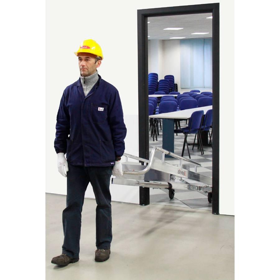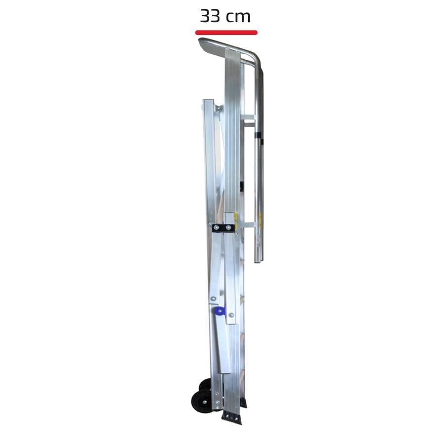 dos operadores. Incluí corrimão de proteção e barra de reforço antiabertura/fecho acidental para a máxima segurança. Equipado com rodas e braços para facilitar o seu deslocamento e o seu fecho ocupando apenas 33 cm de largura fechada na sua armazenagem.