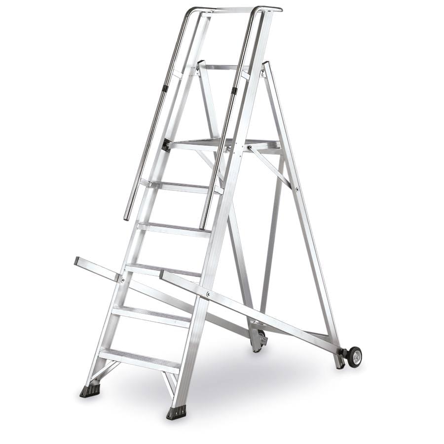 Escadote de armazém profissional com plataforma, degrau largo de 8 cm e uma subida larga.