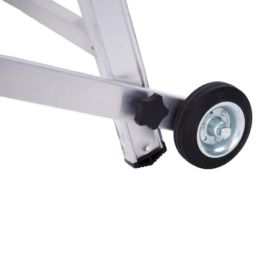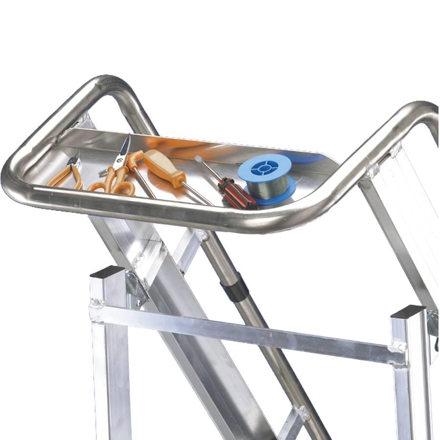 Escadote de uso profissional fabricado com alumínio nervurado que proporciona a máxima robustez, os degraus são soldados aos montantes que criam uma estrutura muito sólida e resistente. Dispõe de uma ampla plataforma de trabalho, de uma bandeja e porta-ferramentas, degraus de 8 cm de profundidade e um corrimão para uma cómoda subida e descida