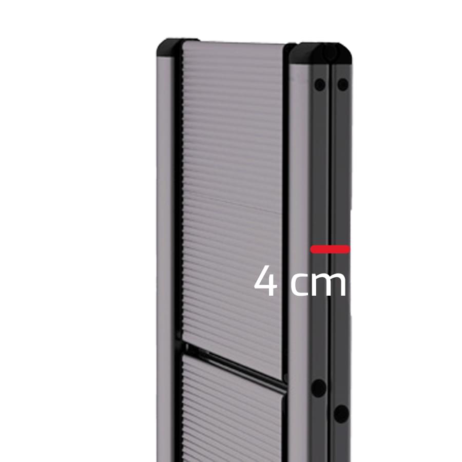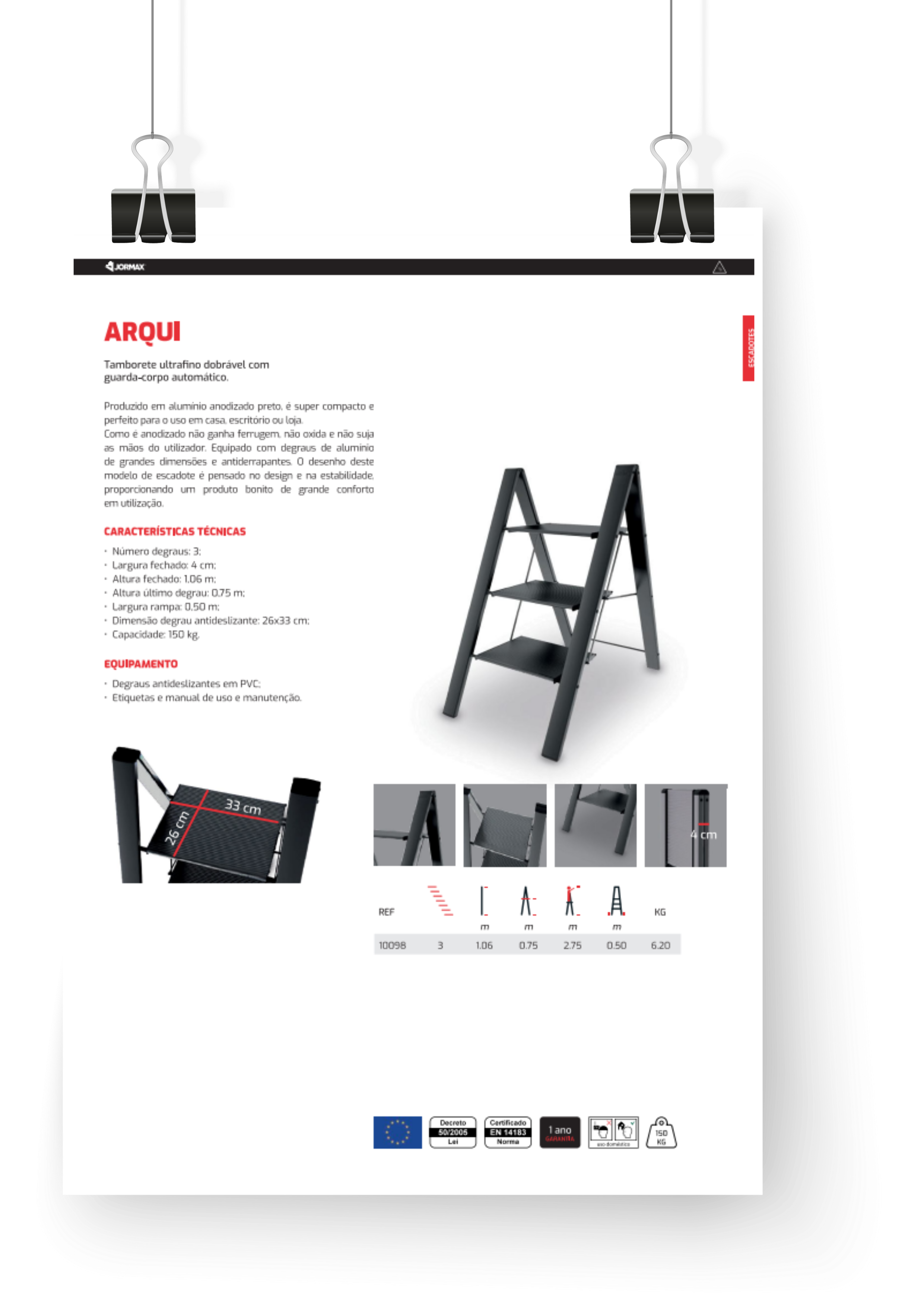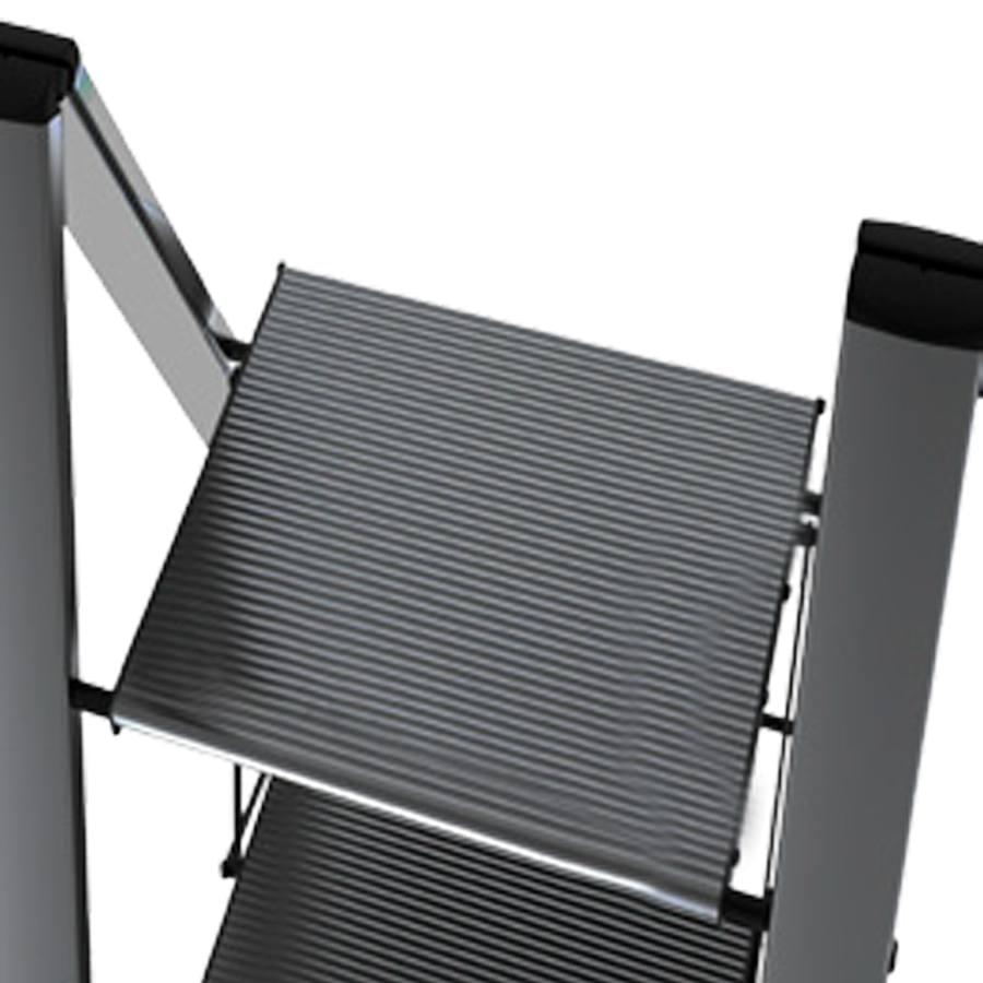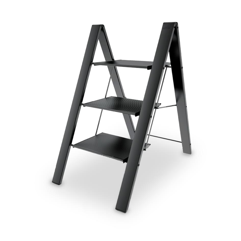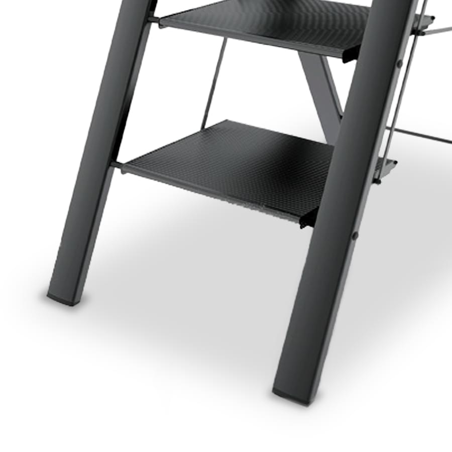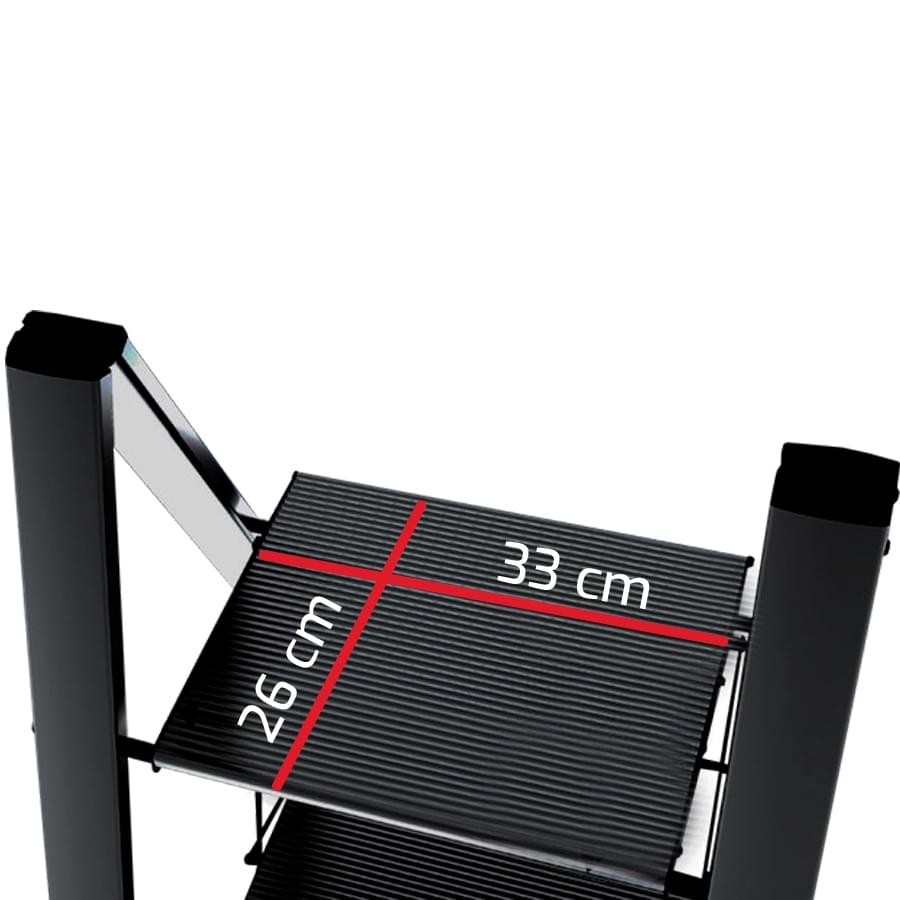 Produzido em alumínio anodizado preto, é super compacto e perfeito para o uso em casa, escritório ou loja. Como é anodizado não ganha ferrugem, não oxida e não suja as mãos do utilizador. Equipado com degraus de alumínio de grandes dimensões e antiderrapantes. O desenho deste modelo de escadote é pensado no design e na estabilidade, proporcionando um produto bonito de grande conforto em utilização.