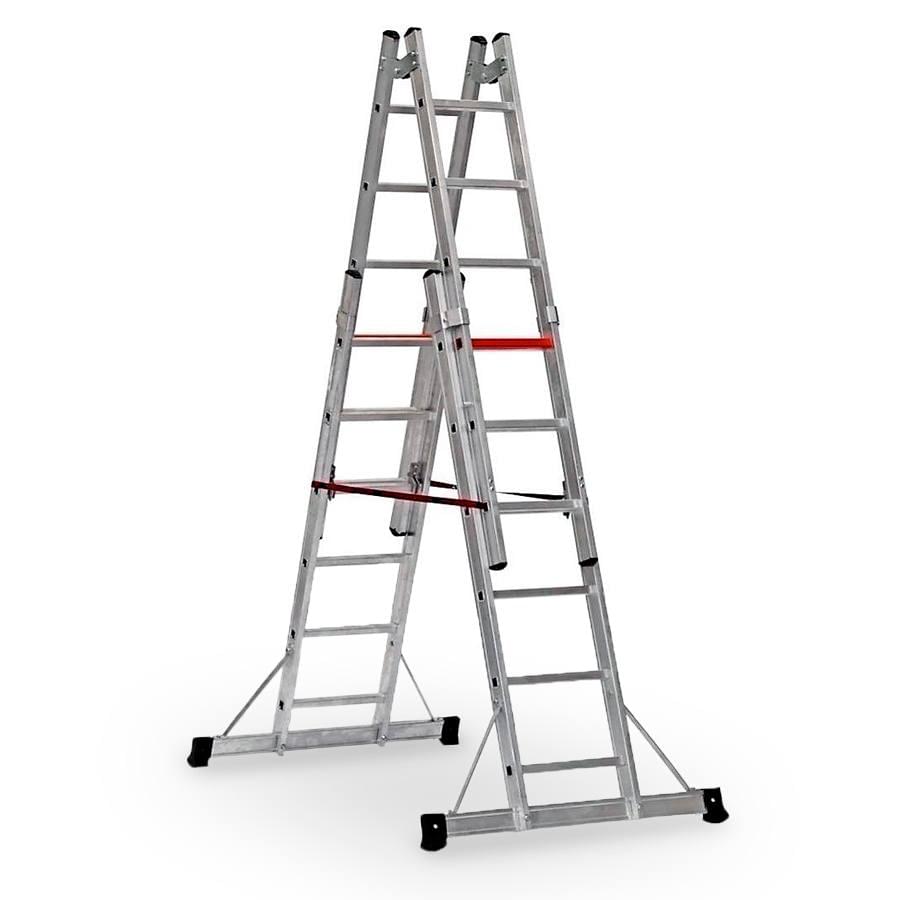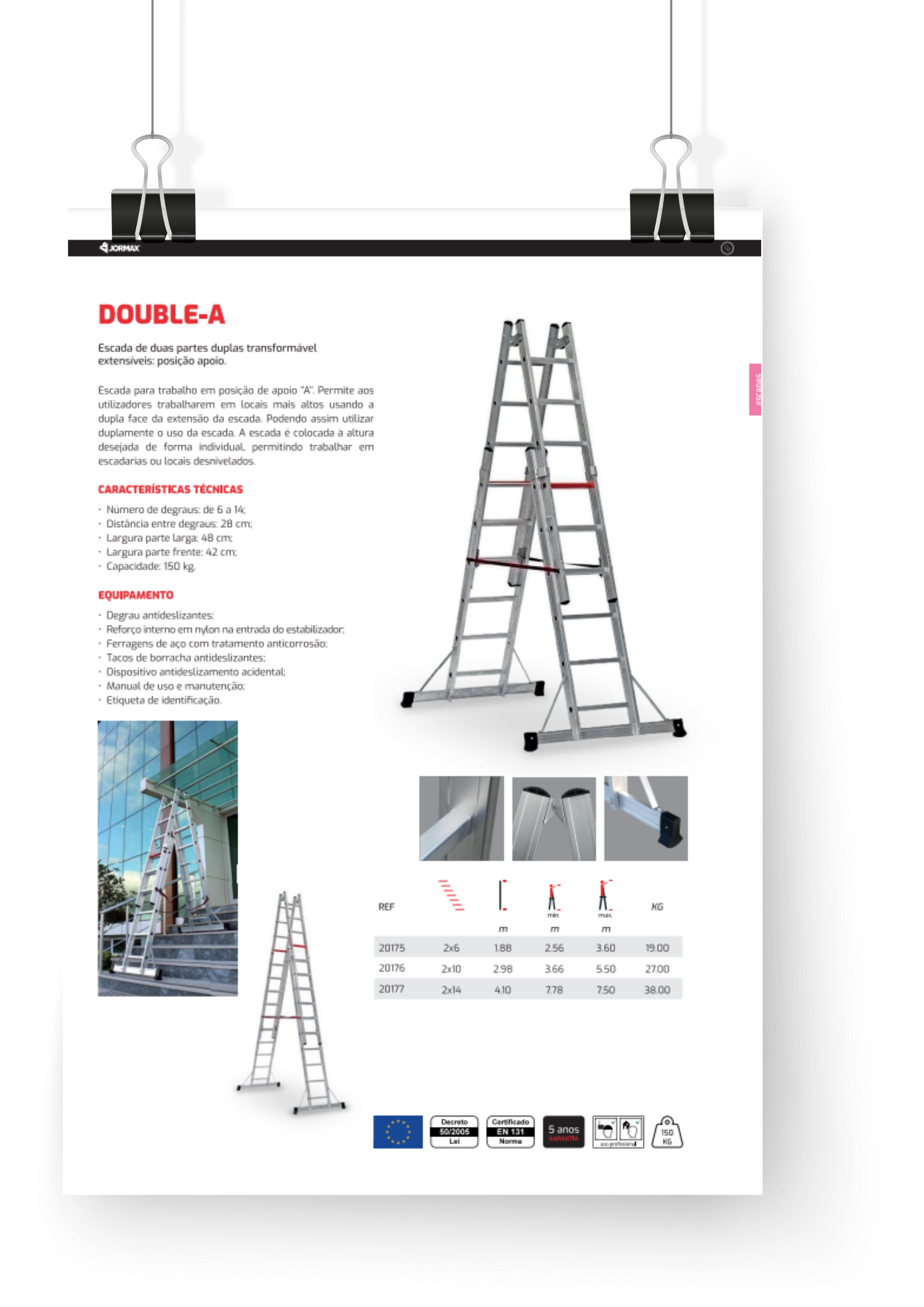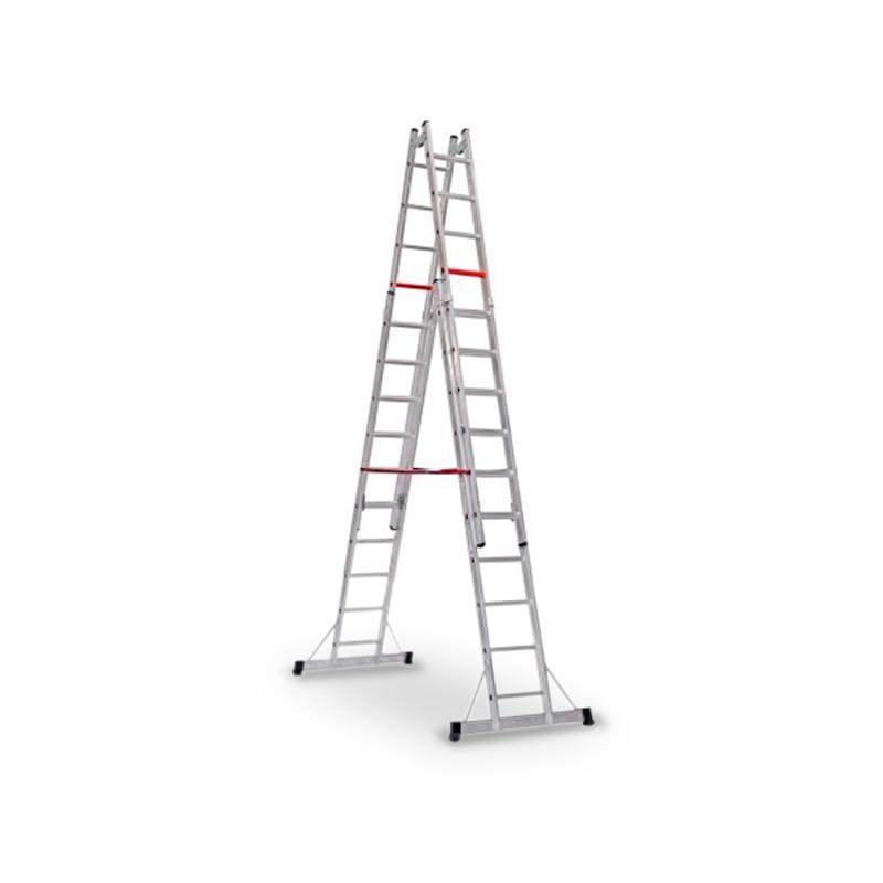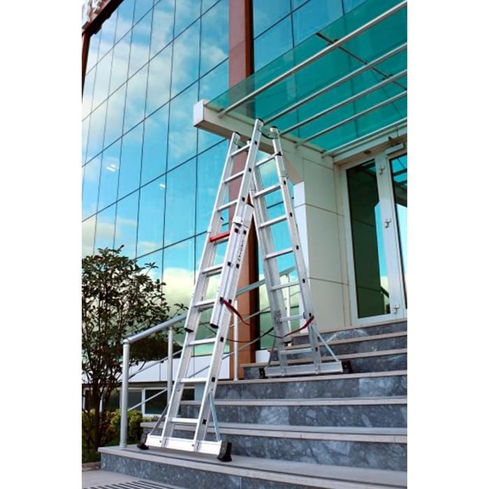 Escada para trabalho em posição de apoio “A”. Permite aos utilizadores trabalharem em locais altos usando a dupla face da extensão da escada. Podendo assim utilizar duplamente o uso da escada. A escada é colocada à altura desejada de forma individual, permitindo trabalhar em escadarias ou locais desnivelados.