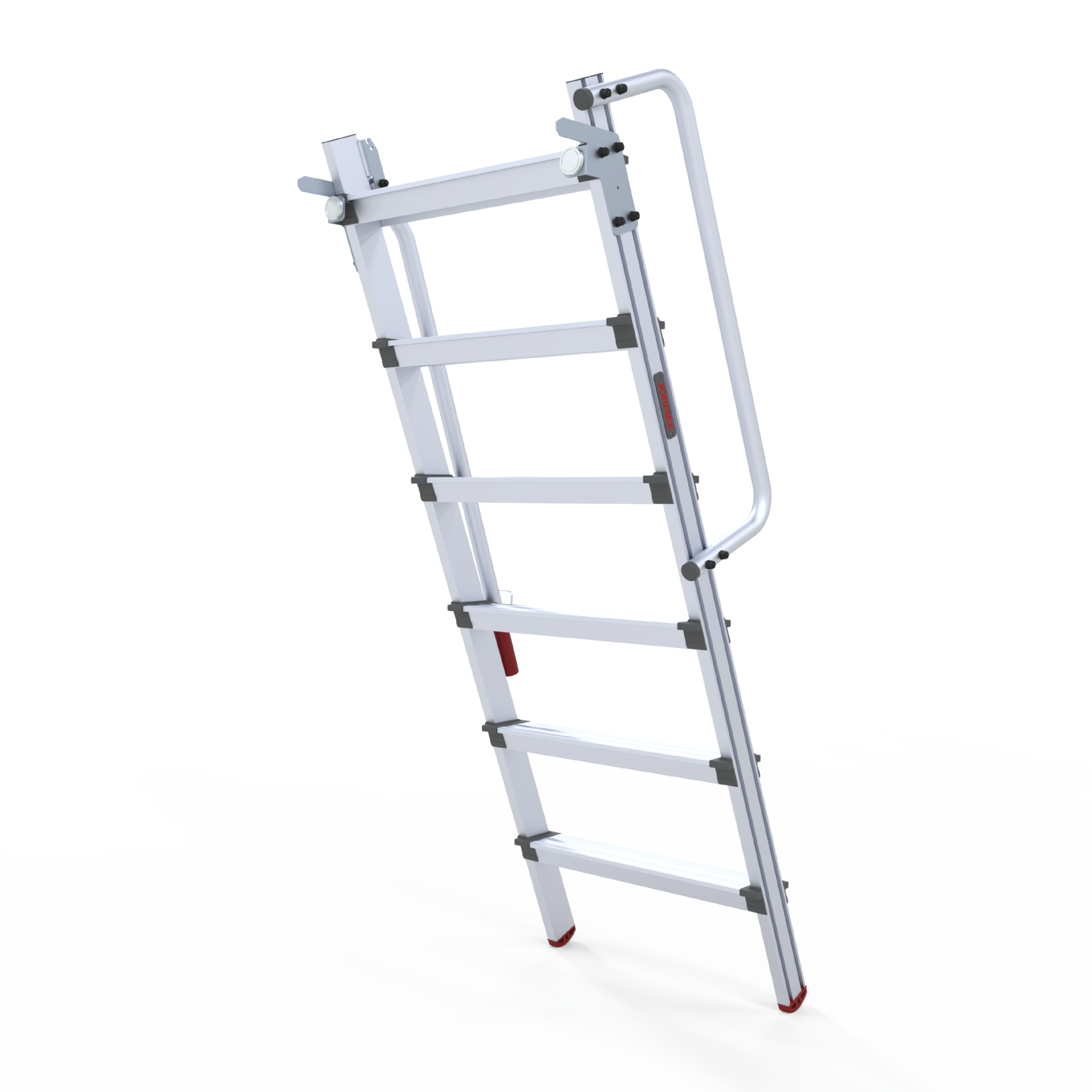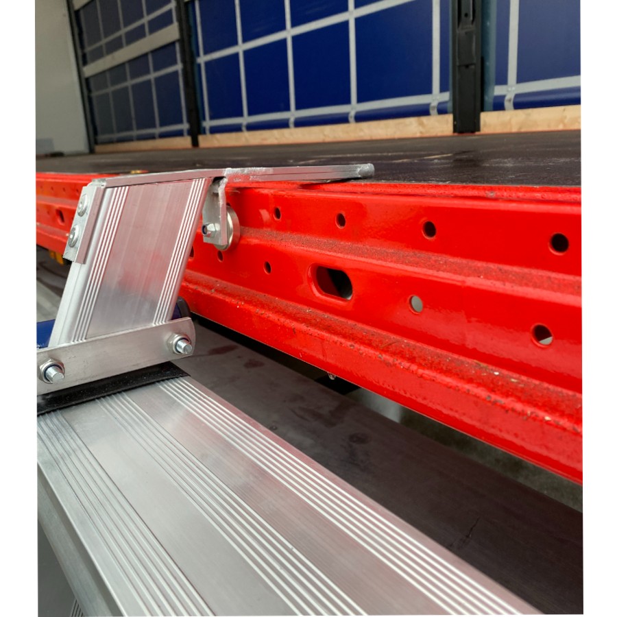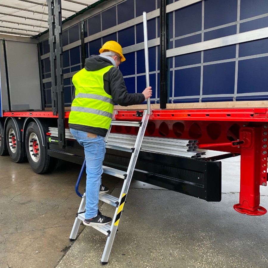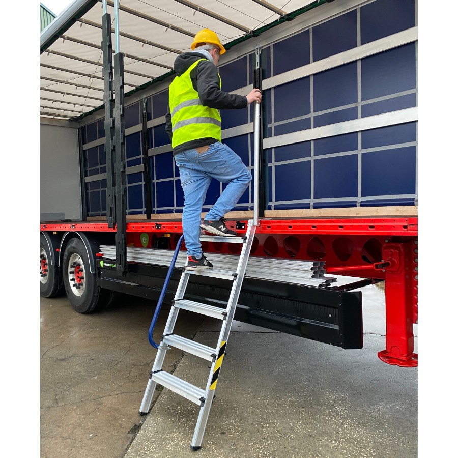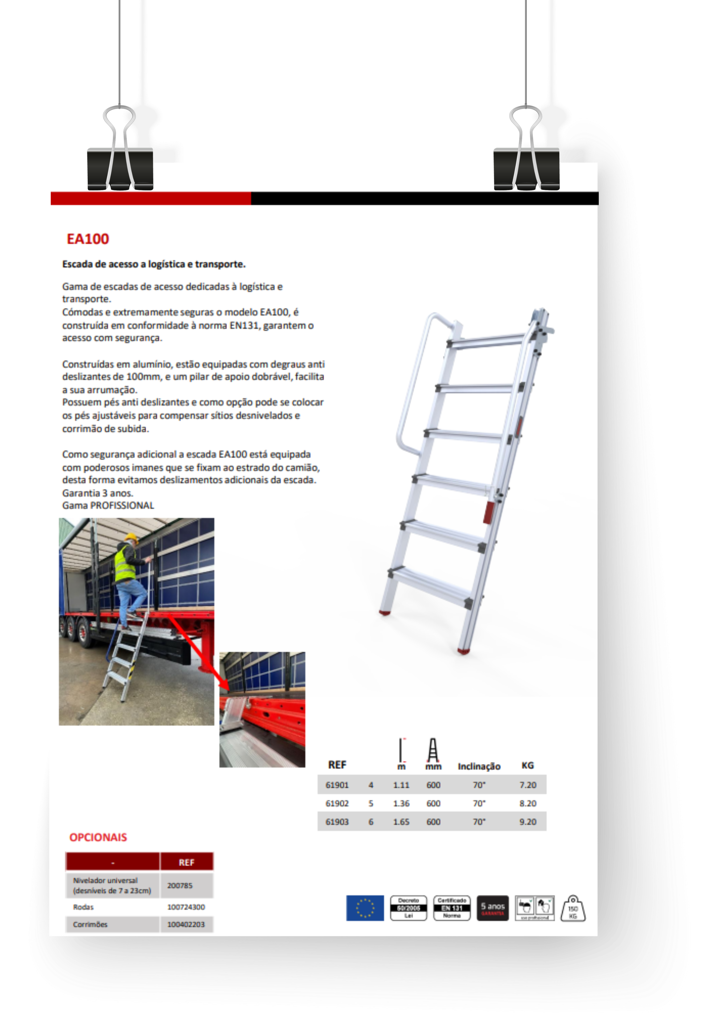 Gama de escadas de acesso dedicadas à logística e transporte. Cómodas e extremamente seguras o modelo EA100, é construída em conformidade à norma EN131, garantem o acesso com segurança. Construídas em alumínio, estão equipadas com degraus anti deslizantes de 100 mm, e um pilar de apoio dobrável, facilita a sua arrumação. Possuem pés anti deslizantes e como opção pode se colocar os pés ajustáveis para compensar sítios desnivelados e corrimão de subida. Como segurança adicional a escada EA100 está equipada com poderosos imanes que se fixam ao estrado do camião, desta forma evitamos deslizamentos adicionais da escada. Garantia 3 anos.