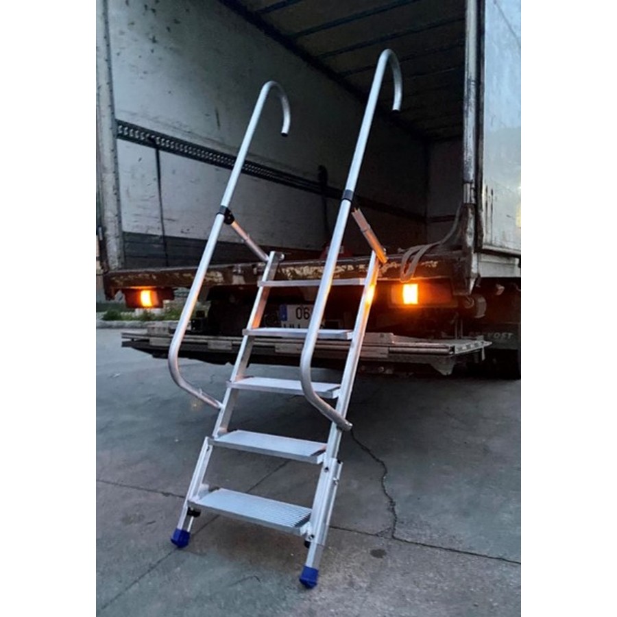 Cómodas e extremamente seguras o modelo ES200, é construída em conformidade à norma EN14122, garantem o acesso com segurança. Construídas em alumínio, estão equipadas com degraus anti deslizantes de 200mm, com 2 corrimões laterais dobráveis, facilita a sua arrumação. Possuem pés anti deslizantes e como opção pode se colocar os pés ajustáveis para compensar sítios desnivelados. Como segurança adicional a escada ES200 está equipada com poderosos imanes que se fixam ao estrado do camião, desta forma evitamos deslizamentos adicionais da escada. Garantia 5 anos.