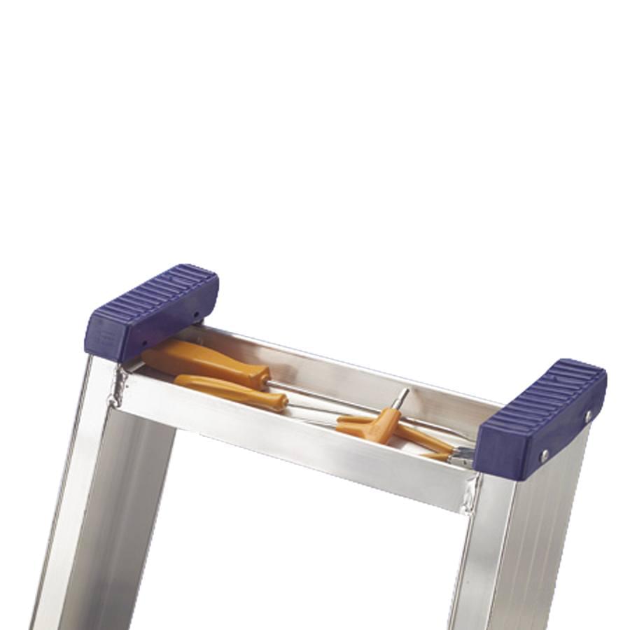 Escadote de uso profissional fabricado em alumínio nervurado que confere a máxima robustez. Degraus soldados aos montantes criando uma estrutura muito resistente. É 50 mm mais largo e dispõem uma plataforma de trabalho mais espaçosa e cómoda que aumenta o nível de conforto do trabalho do trabalhador.