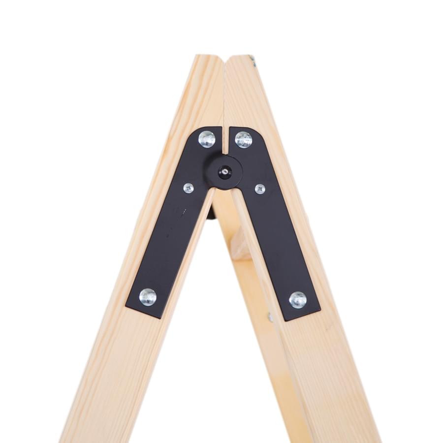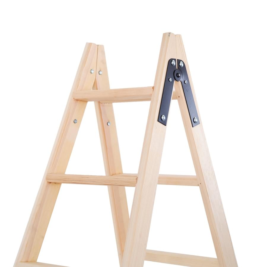 Escadote duplo de uso profissional fabricado em madeira pinho, os degraus estão prensados mediante um sistema inovador aos montantes laterais, dando lugar a uma estrutura muito sólida e resistente. Os degraus dispõem de uma ampla base de trabalho onde os operadores podem trabalhar com total comodidade e segurança. As dobradiças em aço de alta resistência são lacadas a preto. Os pés de borracha de grandes dimensões são antiderrapantes.