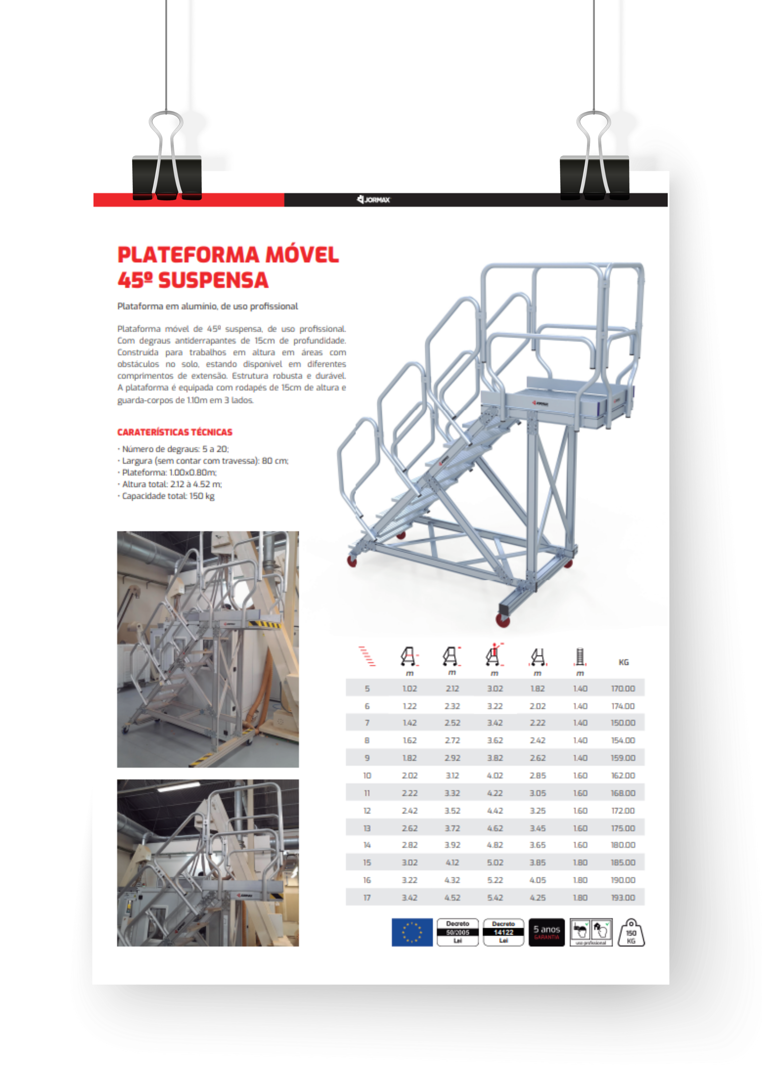 Plataforma móvel de 45º suspensa, de uso profissional. Com degraus antiderrapantes de 15cm de profundidade. Construída para trabalhos em altura em áreas com obstáculos no solo, estando disponível em diferentes comprimentos de extensão. Estrutura robusta e durável. A plataforma é equipada com rodapés de 15cm de altura e guarda-corpos de 1.10m em 3 lados.
