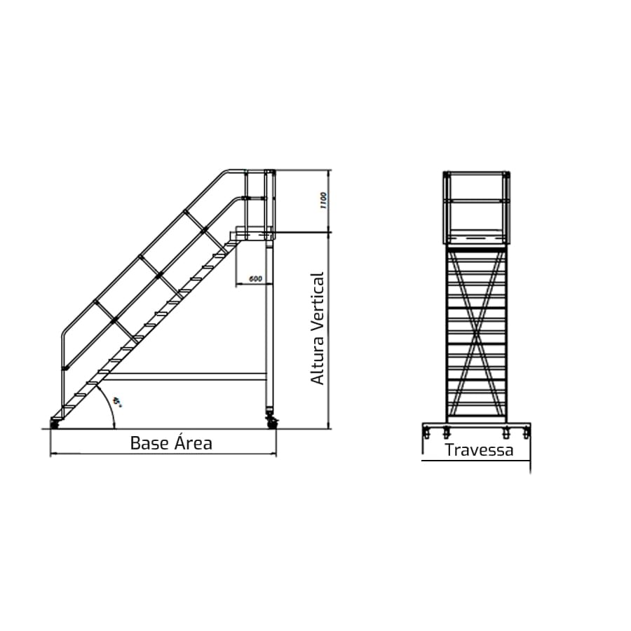 Construída em alumínio extrudido com uma ampla plataforma de trabalho 600, 800 ou 1000×240 mm, rodapé e guarda-corpo de proteção de 1,10 m de altura. A rampa de subida é larga e cómoda, tem uma inclinação de 45° com degraus antideslizantes de 24 cm de profundidade e uma distância entre degraus de 20 cm. Para evitar gastos excessivos de transporte a plataforma é comercializada desmontada, seguindo um livro de instruções de montagem. A traseira é perpendicular ao solo de modo a permitir ao utilizador um acesso muito próximo à parede ou à máquina. A escada pode ser facilmente transportada ao lugar de trabalho graças às rodas.