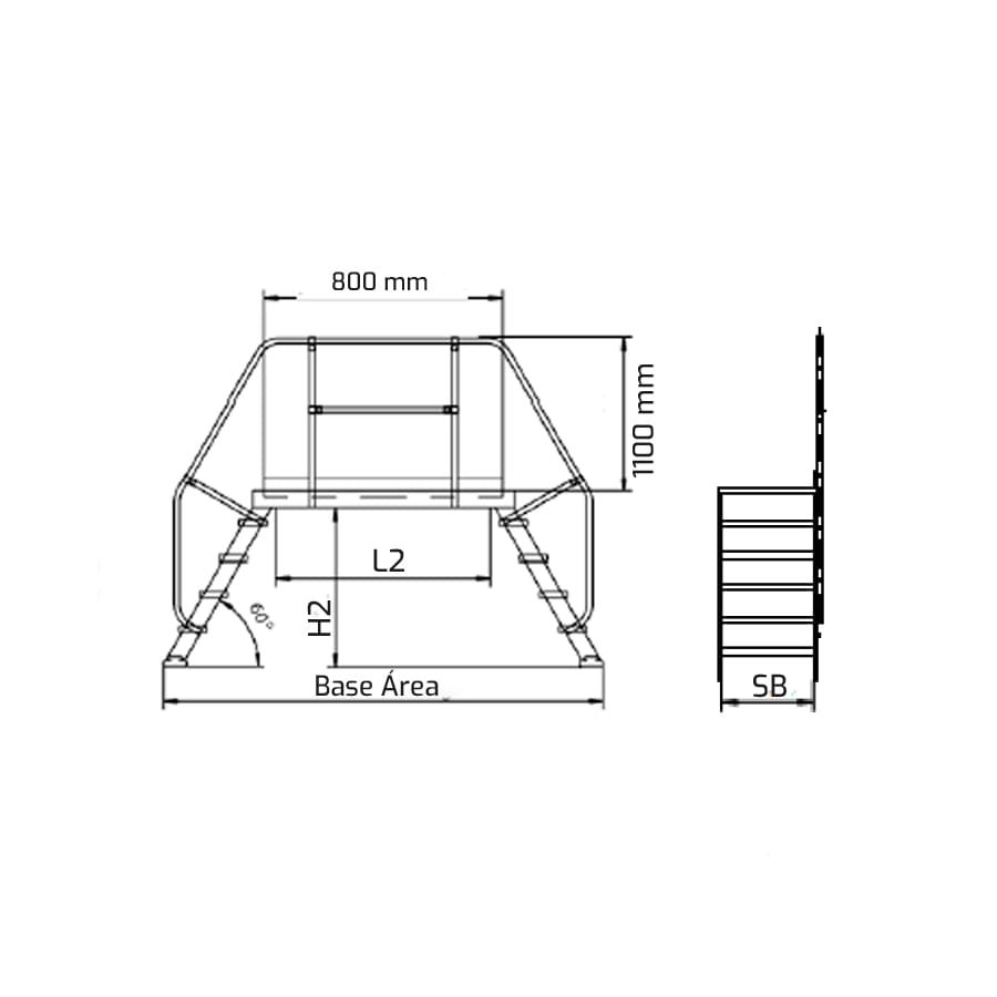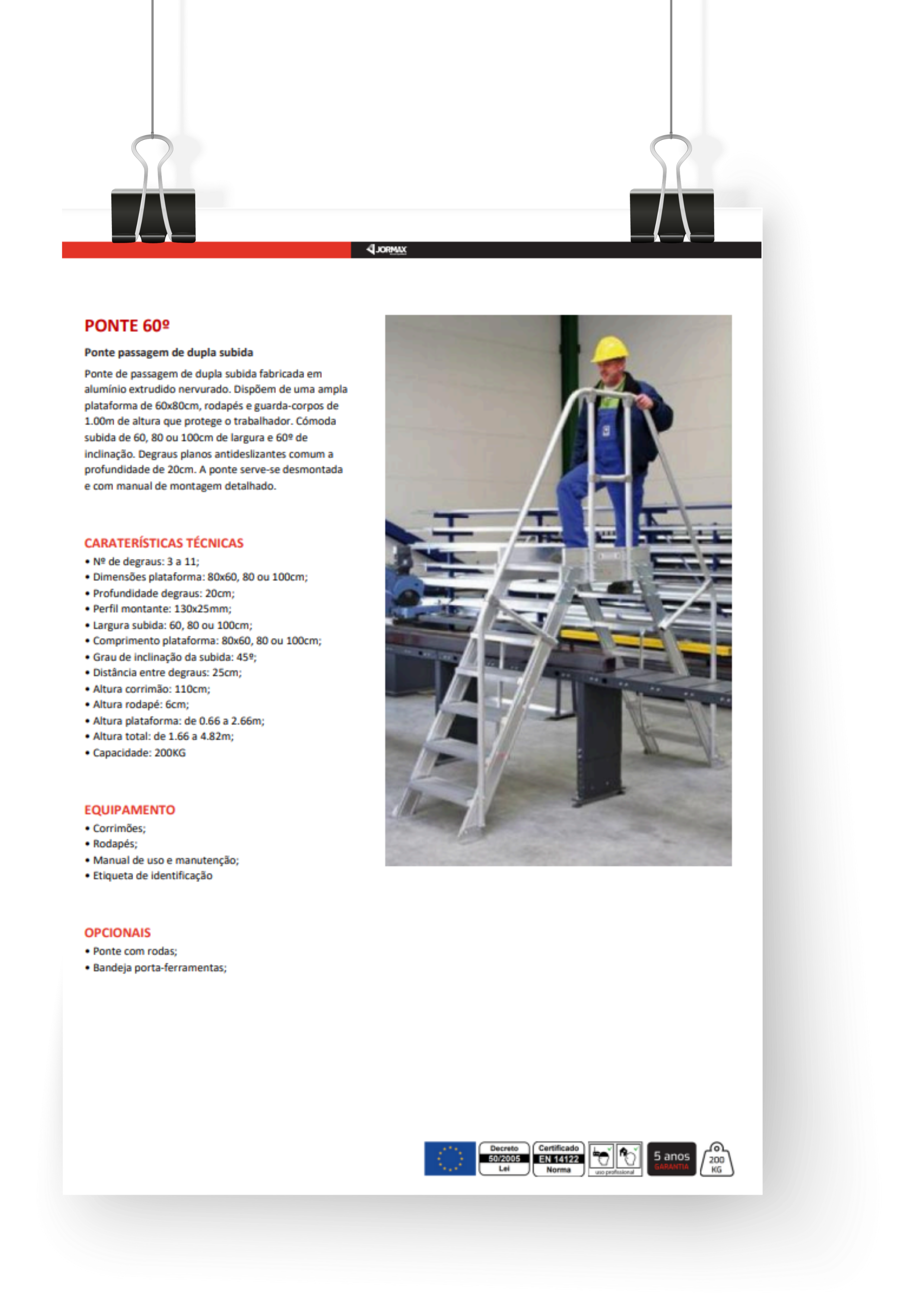 Ponte de passagem de dupla subida fabricada em alumínio extrudido nervurado. Dispõe de uma ampla plataforma de 60×80 cm, rodapés e guarda-corpos de 1 m de altura que protege o trabalhador. Cómoda subida de 60, 80 ou 100 cm de largura e 60° de inclinação, degraus planos antideslizantes com uma profundidade de 20 cm. A ponte é entregue desmontada e com manual de montagem detalhado.