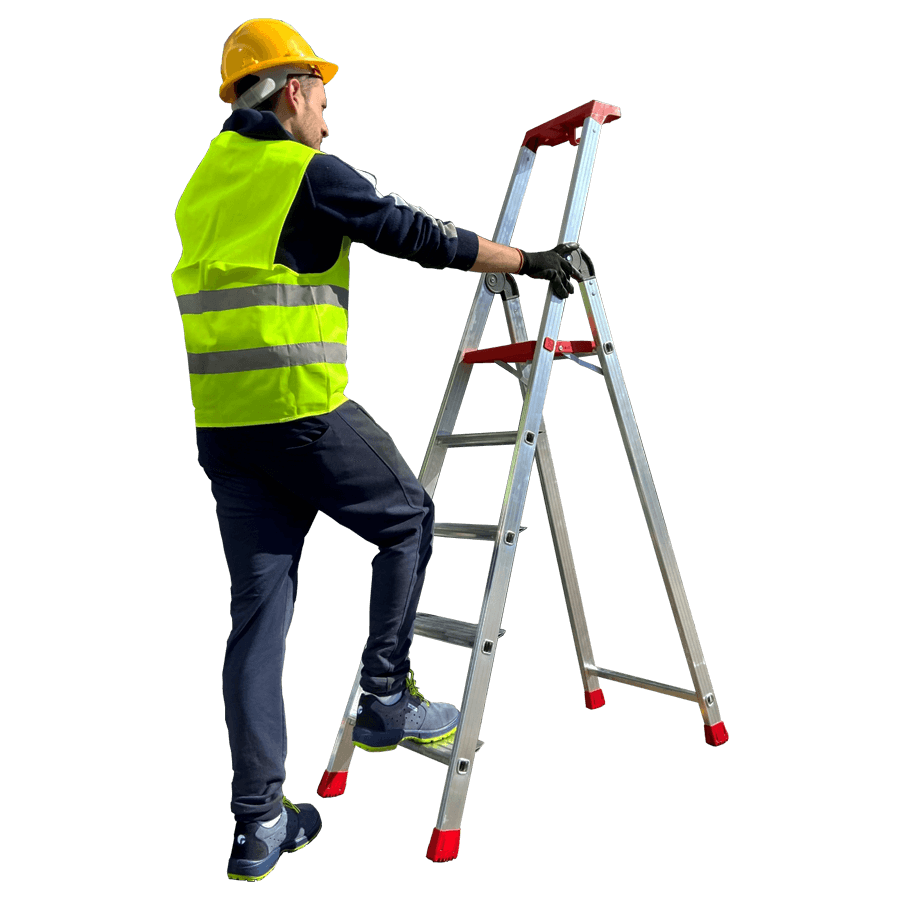 A norma europeia EN 131 proíbe estar nos dois últimos degraus na ausência de guarda-corpos.