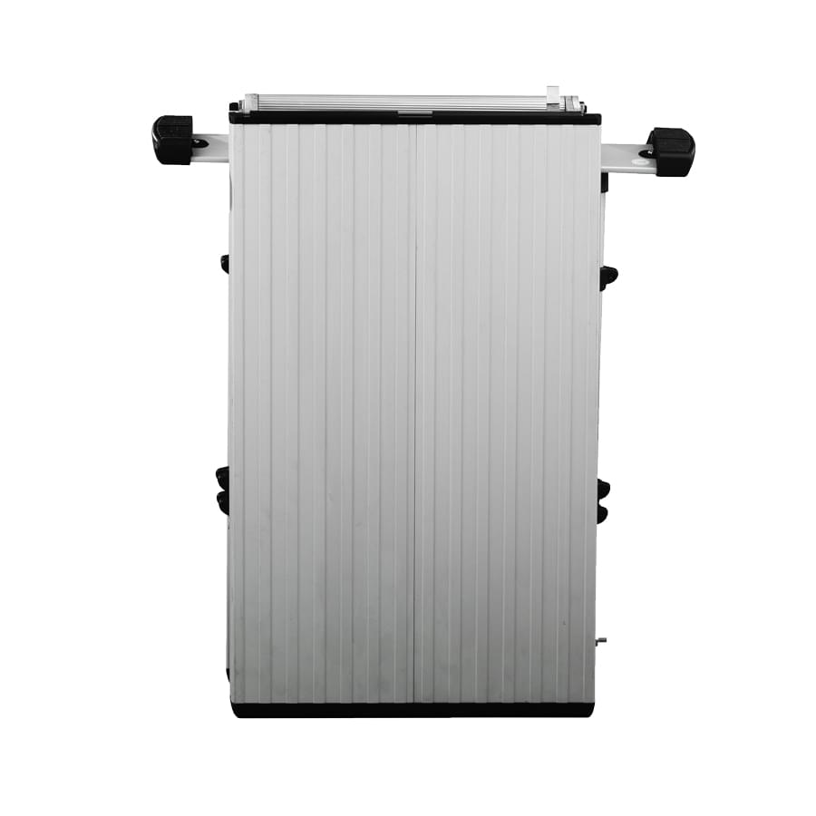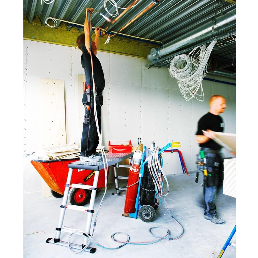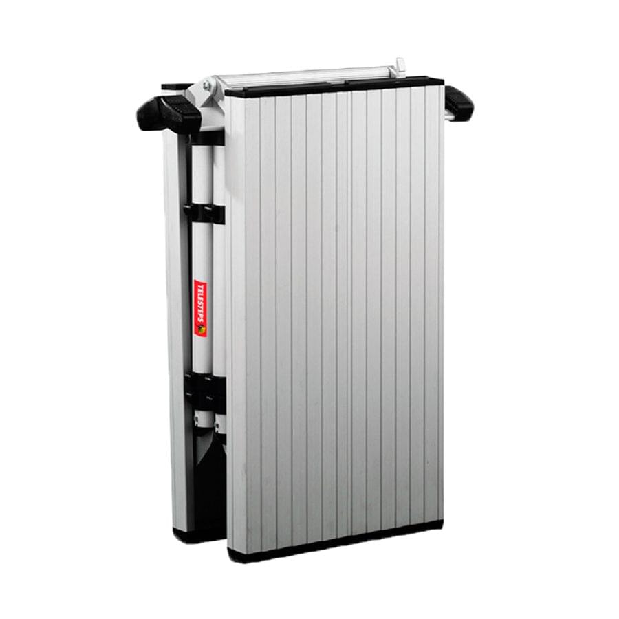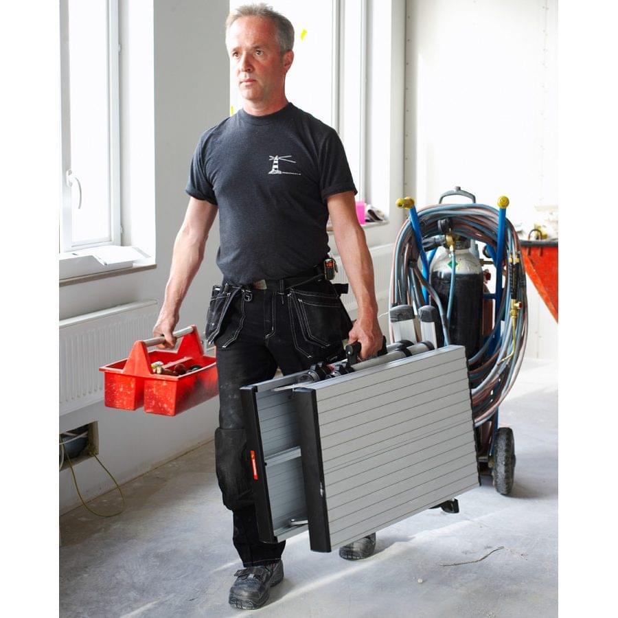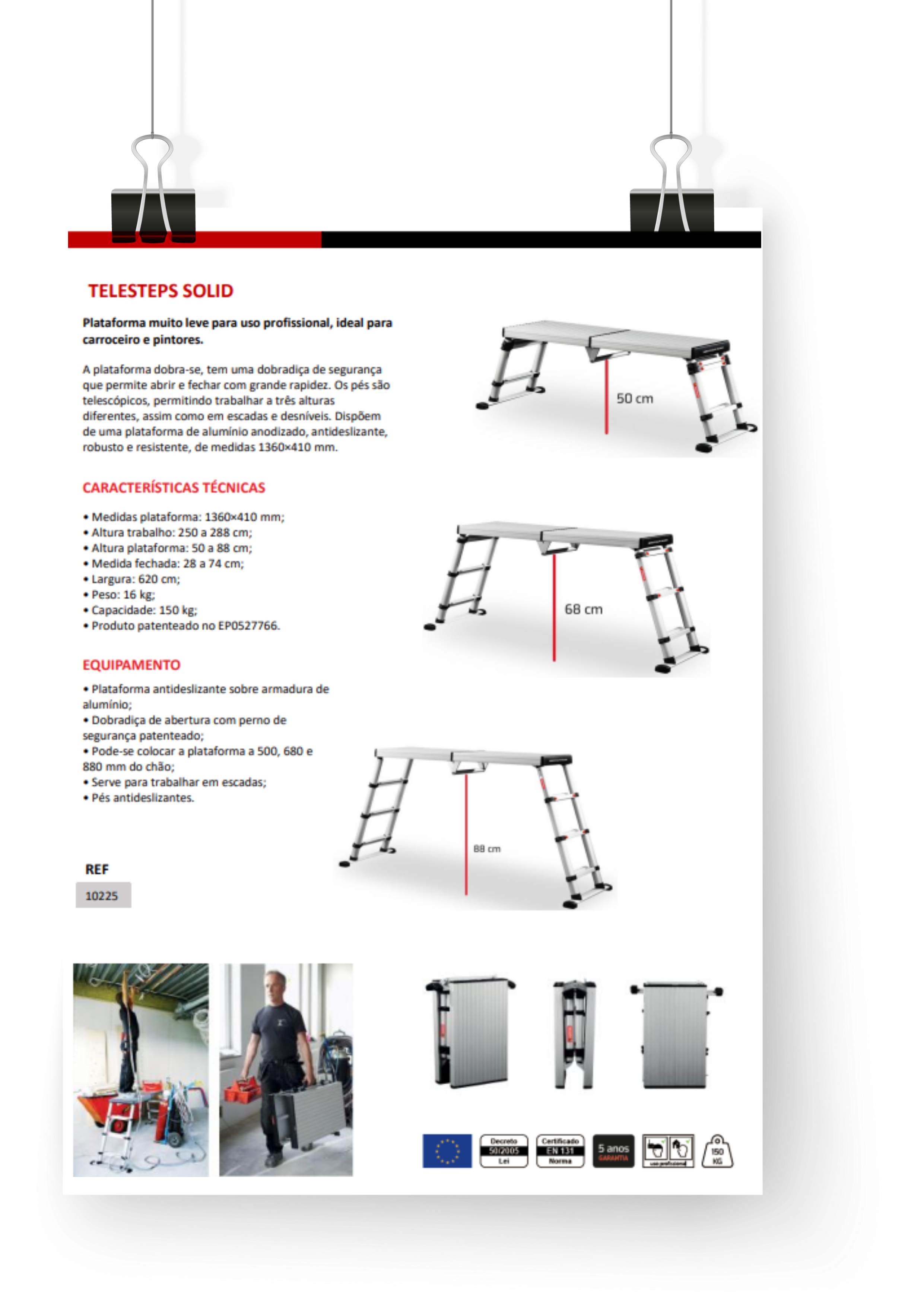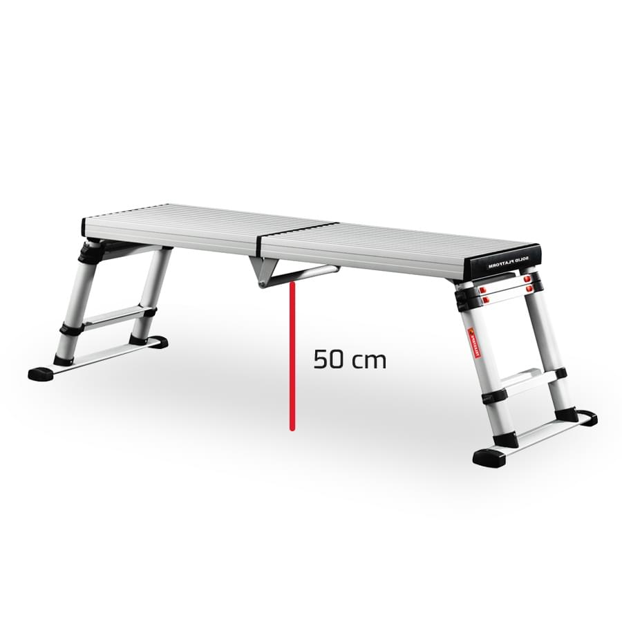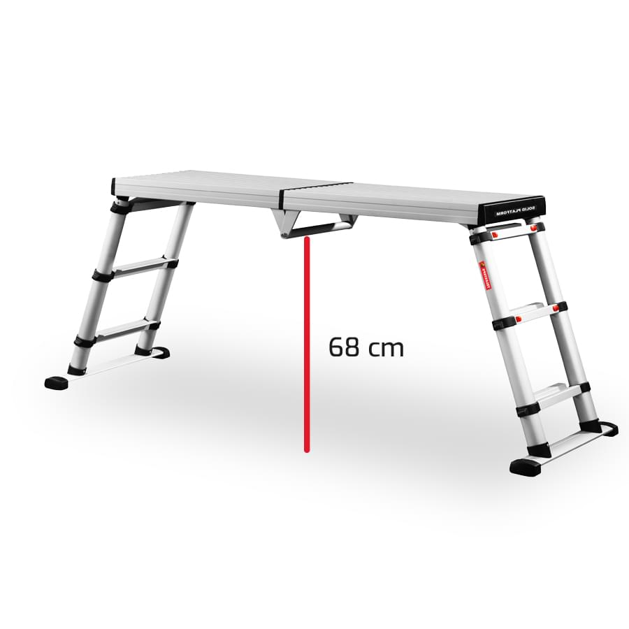A plataforma dobra-se, tem uma dobradiça de segurança que permite abrir e fechar com grande rapidez. Os pés são telescópicos, permitindo trabalhar a três alturas diferentes, assim como em escadas e desníveis. Dispõem de uma plataforma de alumínio anodizado, antideslizante, robusto e resistente, de medidas 1360×410 mm.
